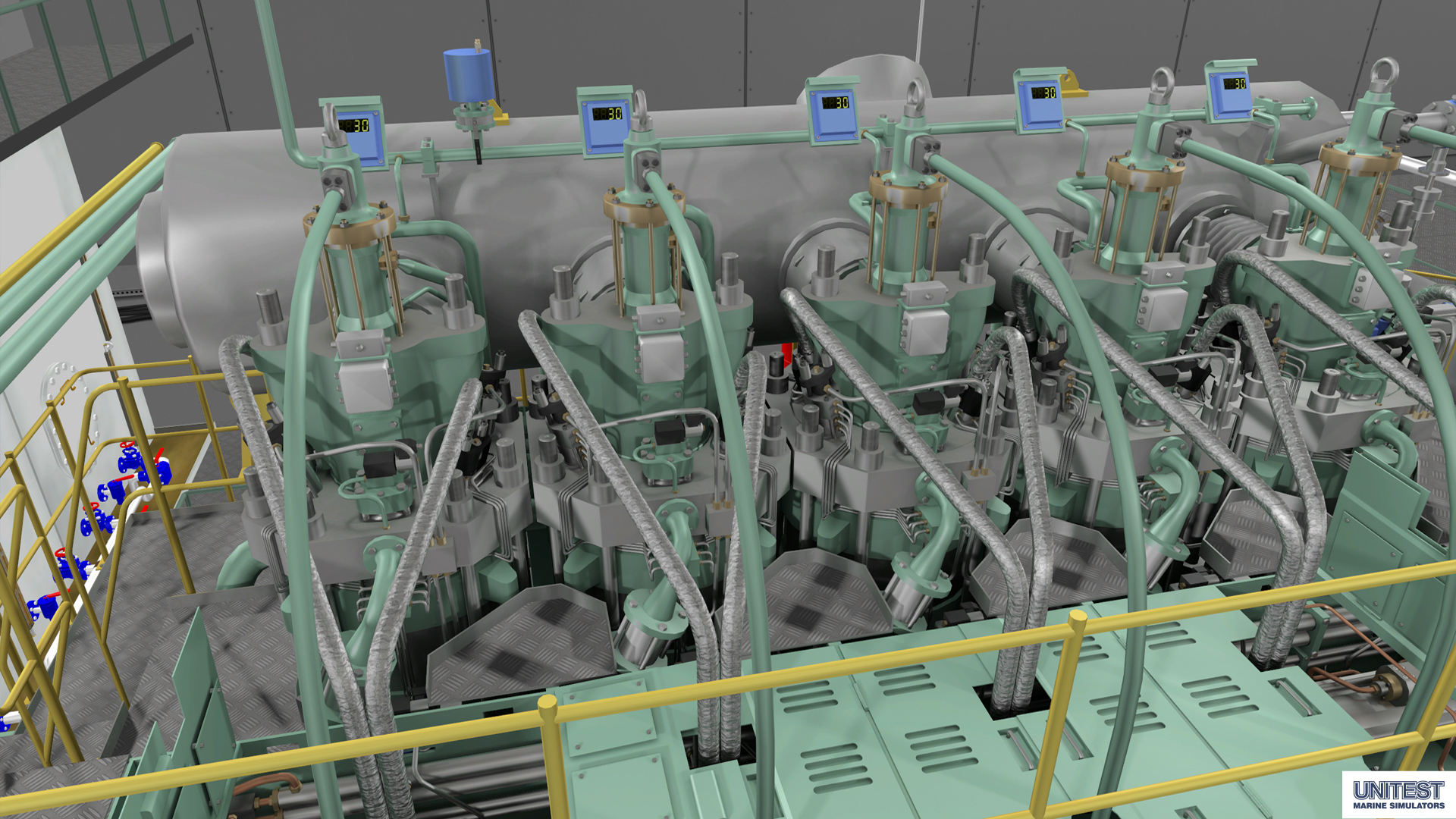 Подготовка проходила с использованием тренажера Low Speed Engine Room W-Xpert RT-flex50DF Simulator. Математическая модель тренажера имитирует главную двигательную установку судна – низкооборотный пятицилиндровый двухтактный реверсивный двухтопливный дизельный двигатель с турбонаддувом.
